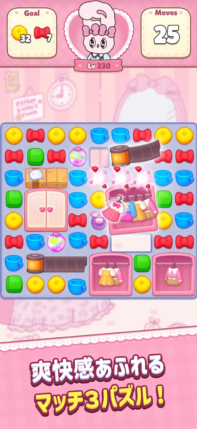 パズルをクリアすると着せ替えアイテムや家具がもらえて、数百種類のアイテムでお部屋や衣装を自由にコーディネートできるのが最大の特徴です。
