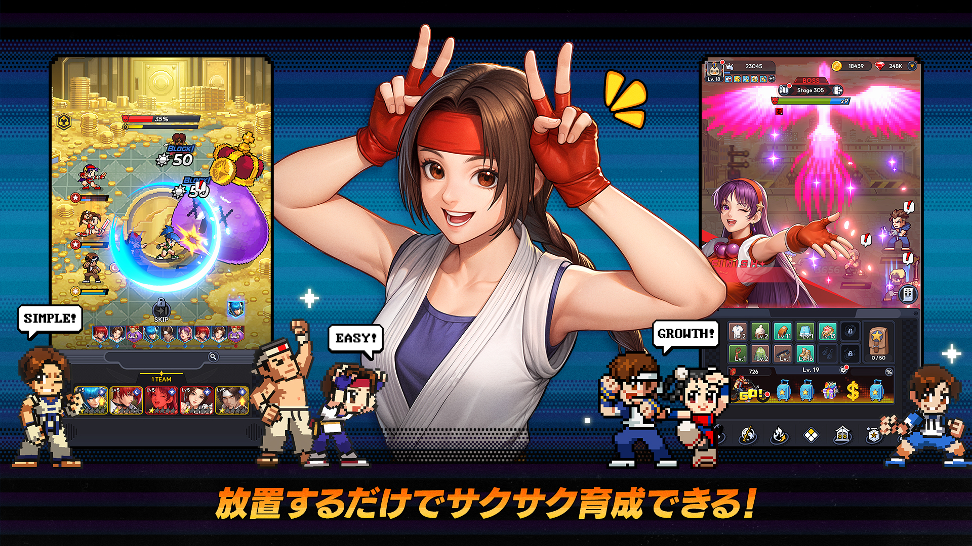 あの人気格闘ゲーム「KOF」の歴代ファイターたちが、懐かしくも新しいドット絵となって大暴れする放置系RPGです。