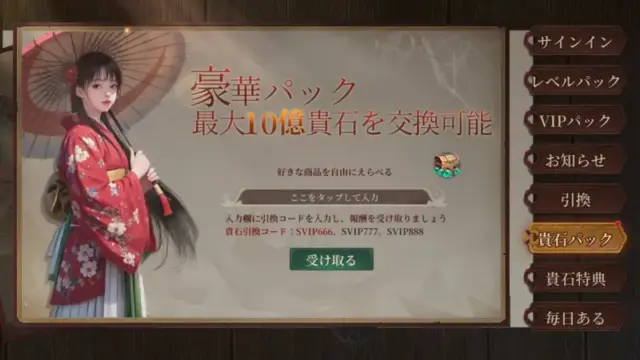 キャンペーンコード「SVIP666」「SVIP777」「SVIP888」の3種類を入力することで、育成に役立つ便利なアイテムを獲得できます。