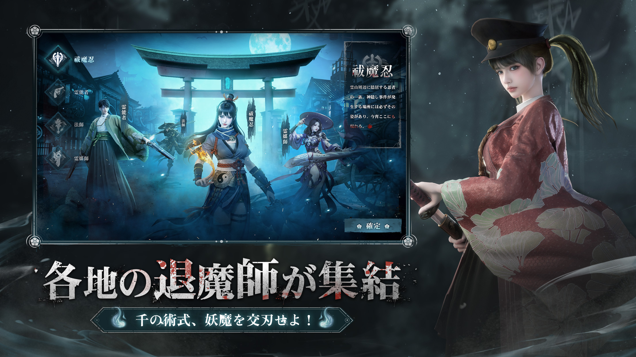 最初に「霊能者」や「祓魔忍」など4種類の職業から、性別も自由に選んでキャラクターを作成可能です。